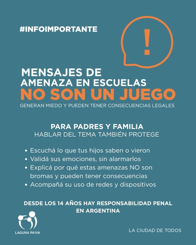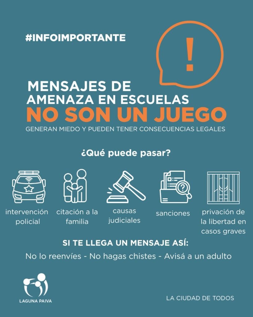 Desde la Municipalidad de Laguna Paiva queremos concientizar a la comunidad sobre la gravedad de los mensajes de amenaza en ámbitos escolares. Este tipo de situaciones generan miedo, alteran la convivencia y pueden derivar en consecuencias legales serias.